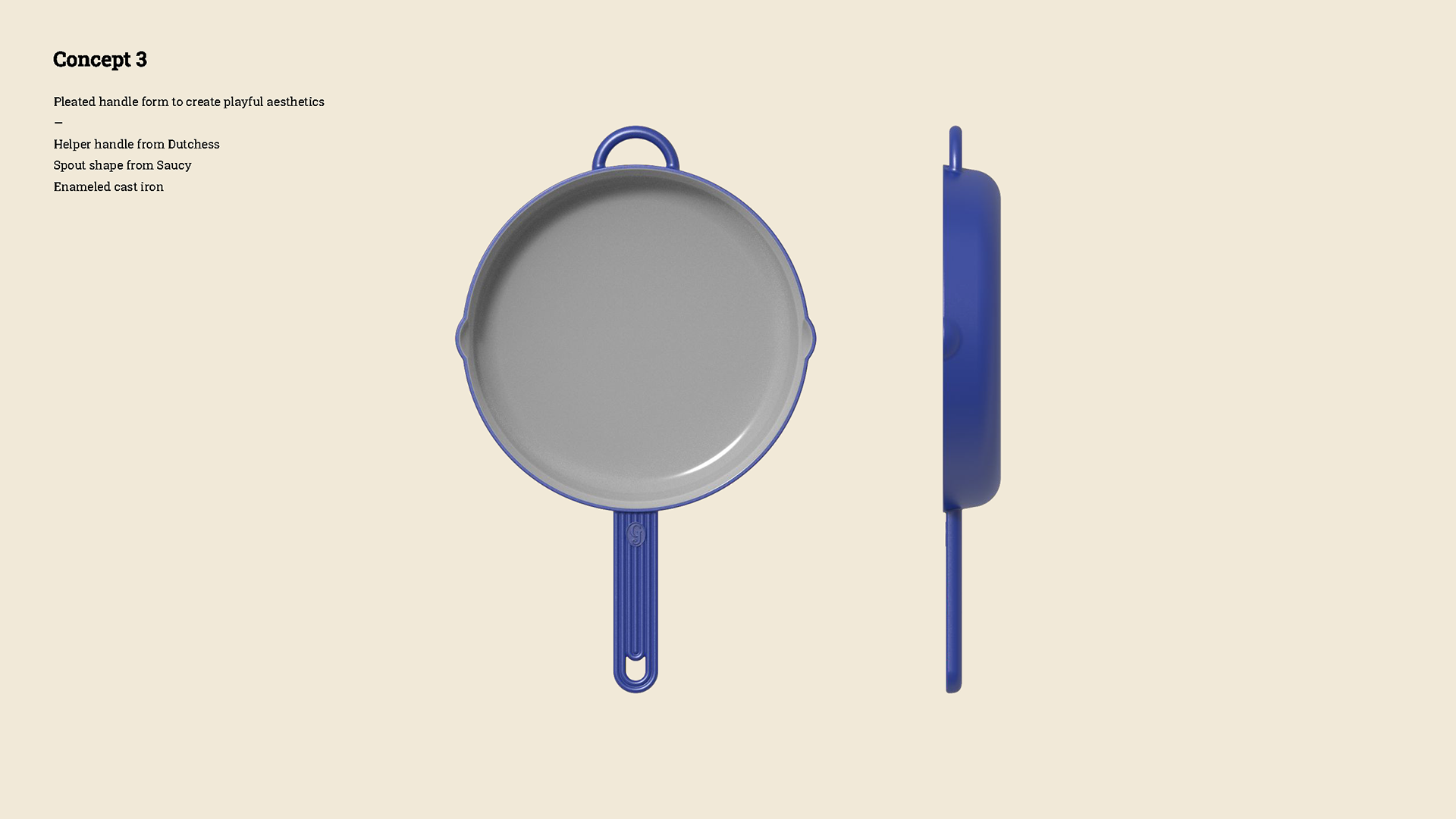 The goal for King Sear was to create a design that looks familiar with Great Jones' product line and branding. First, I took the helper handle from The Dutchess and referenced Saucer's spout and handle. Based on their playful branding and vintage aesthetics, I wanted to create something that's bold yet soft.
